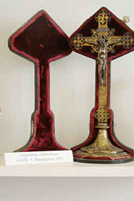 Er war es auch, der ein gutes Wort für Kneipp bei Papst Leo XIII. einlegte. Kneipps Romreise im Jahr 1894 war sicherlich der Höhepunkt seiner Karriere: Das bequeme Reisegewand des Pfarrers sowie weitere Reiseutensilien sehen sie in einer der hohen Vitrinen. Schräg gegenüber ist ein weit festlicheres Gewand ausgestellt. In Rom empfing ihn der Papst in ganzen vier Privataudienzen: Zum Päpstlichen Geheimkämmerer ernannt, trug er künftig den Titel Monsignore.